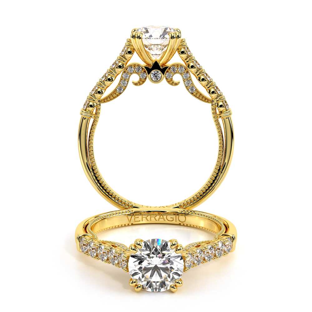 INSIGNIA-7097R Classic engagement ring features a shared-prong set band with round brilliant-cut diamonds. Meticulously set and handcrafted is Insignia's scrollwork which seamlessly flows into Verragio's signature beading and crest.
