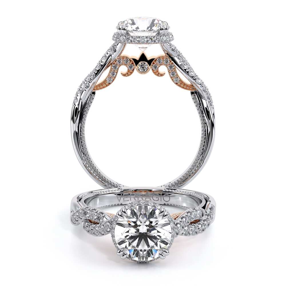 INSIGNIA-7099R Diamond engagement ring featuring Verragio's handcrafted stardust halo adorned with meticulously set round brilliant-cut diamonds atop a twisted band. Accompanying diamond Insignia scrollwork refined with Verragio's timeless signature crest and beading.
