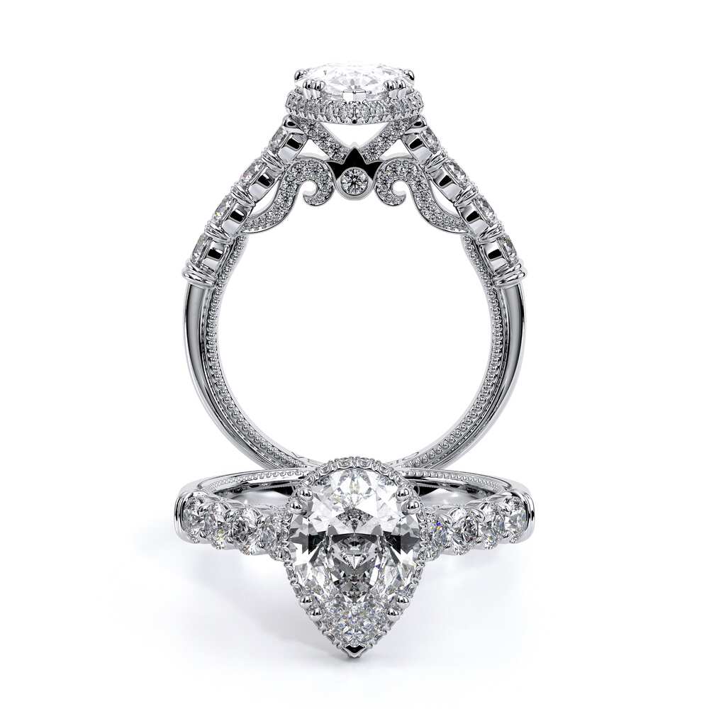 INSIGNIA-7100PEAR Accentuates your Pear engagement ring with a pave set stardust halo illuminated by round brilliant-cut diamonds. Featuring a shared-prong set band and handcrafted Insignia's scrollwork. Refined by Verragio's signature beading and crest.