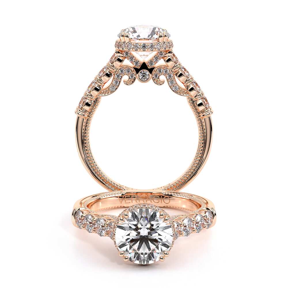 INSIGNIA-7100R Accentuates your Round engagement ring with a pave set stardust halo illuminated by round brilliant-cut diamonds. Featuring a shared-prong set band and handcrafted Insignia's scrollwork. Refined by Verragio's signature beading and crest.
