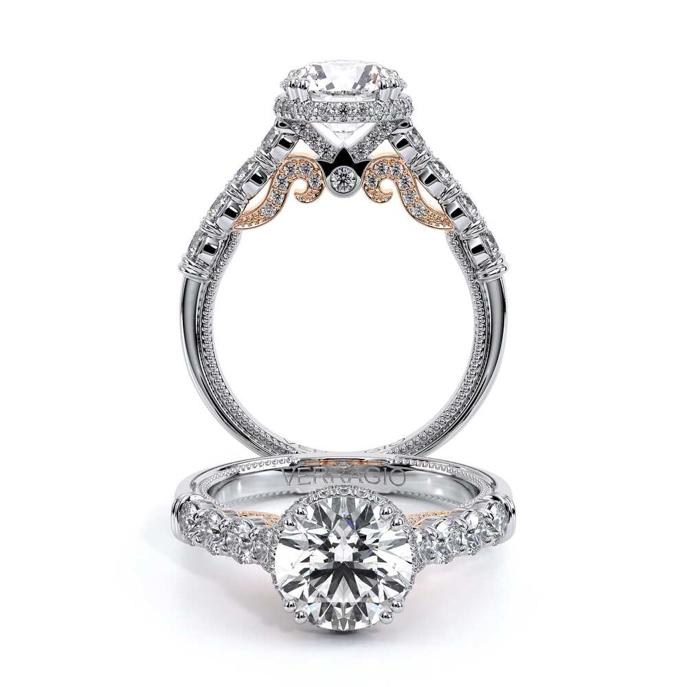 INSIGNIA-7100R Accentuates your Round engagement ring with a pave set stardust halo illuminated by round brilliant-cut diamonds. Featuring a shared-prong set band and handcrafted Insignia's scrollwork. Refined by Verragio's signature beading and crest.