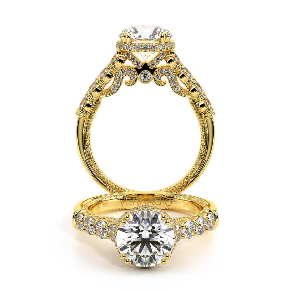INSIGNIA-7100R Accentuates your Round engagement ring with a pave set stardust halo illuminated by round brilliant-cut diamonds. Featuring a shared-prong set band and handcrafted Insignia's scrollwork. Refined by Verragio's signature beading and crest.
