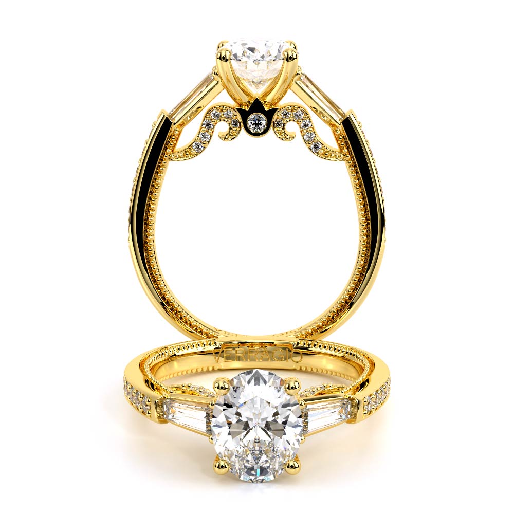 Insignia-7110OV is a enchanting three-stone engagement ring featuring baguette diamond side-stones. Atop a band embellished with round brilliant-cut diamonds, the ring showcases Insignia's bold diamond scrollwork, seamlessly uniting Verragio's iconic crest and signature beading.