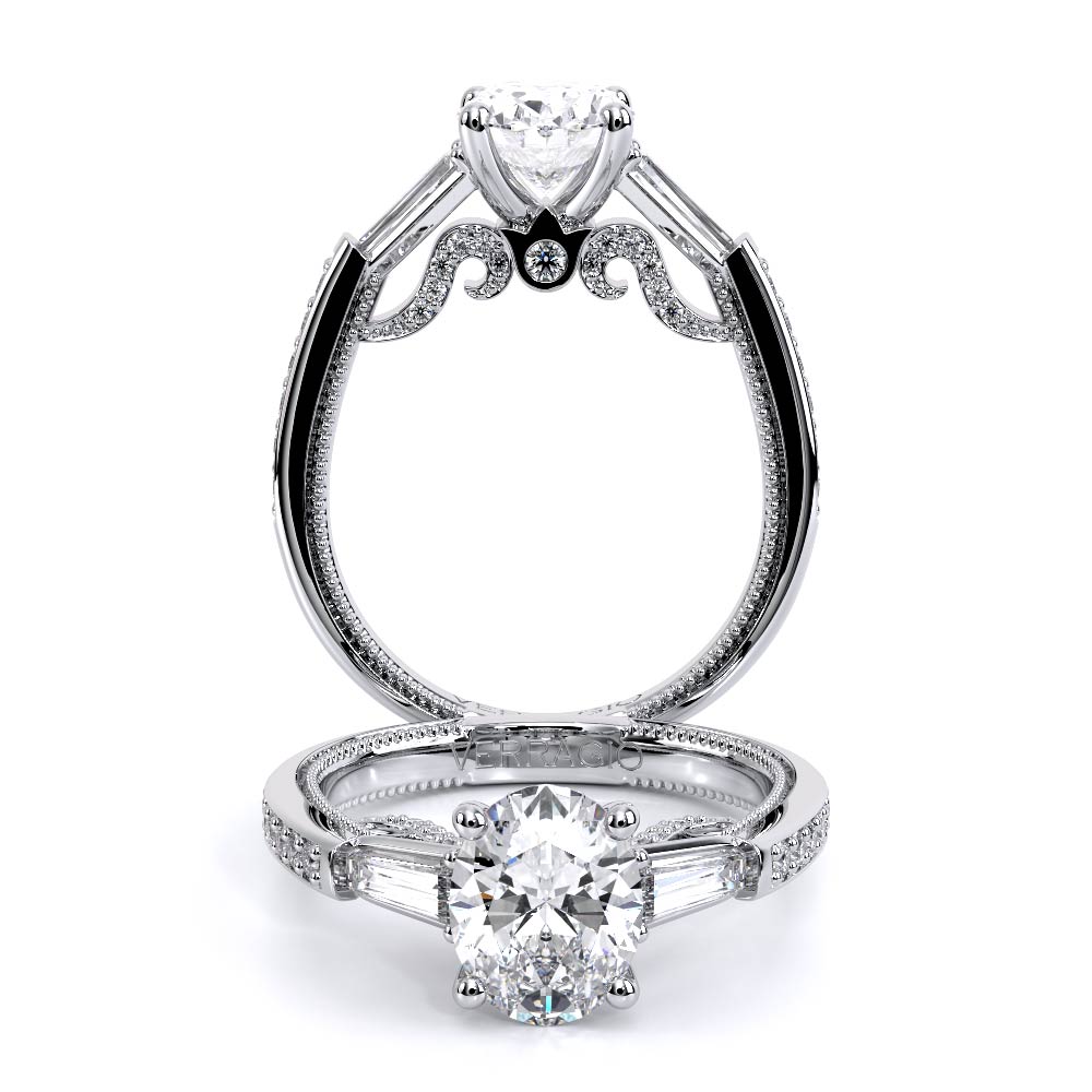 Insignia-7110OV is a enchanting three-stone engagement ring featuring baguette diamond side-stones. Atop a band embellished with round brilliant-cut diamonds, the ring showcases Insignia's bold diamond scrollwork, seamlessly uniting Verragio's iconic crest and signature beading.