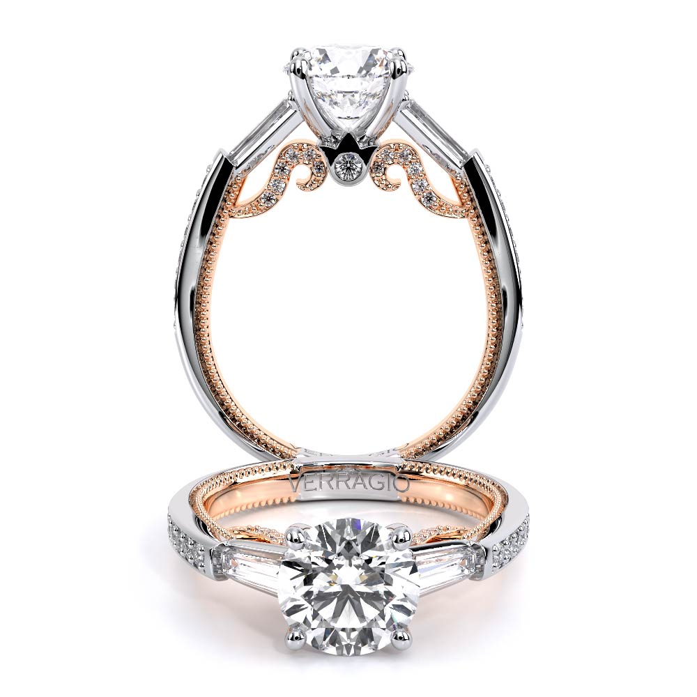 Insignia-7110R is a enchanting three-stone engagement ring featuring baguette diamond side-stones. Atop a band embellished with round brilliant-cut diamonds, the ring showcases Insignia's bold diamond scrollwork, seamlessly uniting Verragio's iconic crest and signature beading.