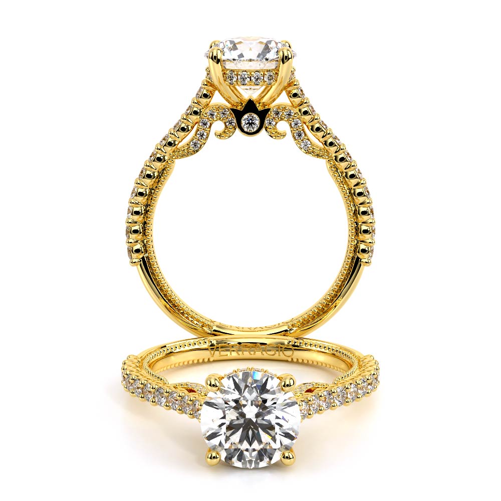 The INSIGNIA-7111R is a classically-evolved engagement ring, featuring pave-set diamonds to encircle and elevate any center stone. Atop a band embellished with round brilliant-cut diamonds, the ring showcases Insignia's bold diamond scrollwork, seamlessly uniting Verragio's iconic crest and signature beading.
