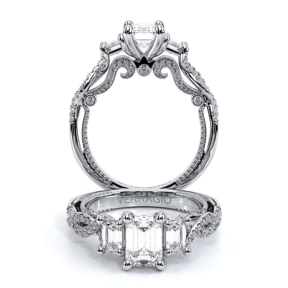 INSIGNIA-7074EM Three stone diamond engagement ring adorned with Verragio's signature beading pave set brilliant-cut diamonds on Insignia's handcrafted scrollwork and twisted band. Refined to enhance a Emerald diamond center.