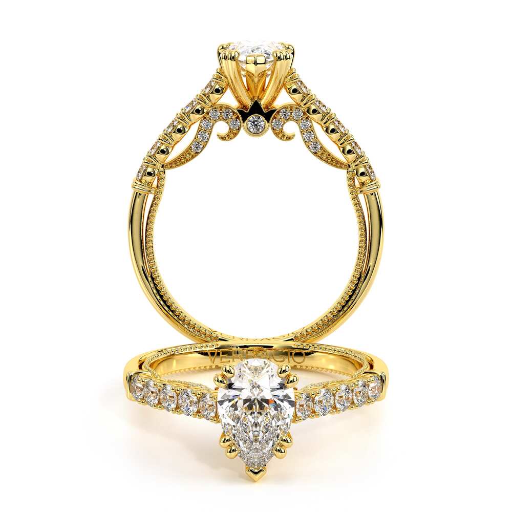 INSIGNIA-7097PEAR Classic engagement ring features a shared-prong set band with round brilliant-cut diamonds. Meticulously set and handcrafted is Insignia's scrollwork which seamlessly flows into Verragio's signature beading and crest.