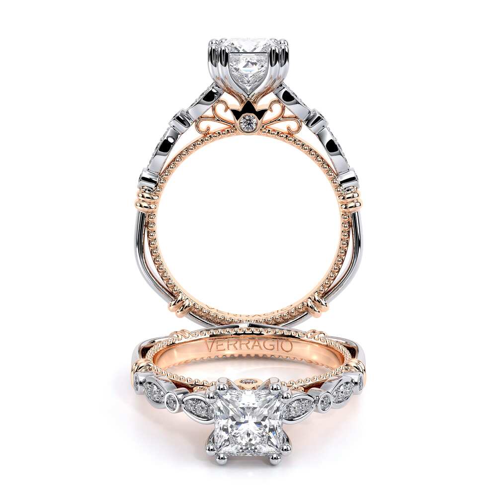 PARISIAN-100P is a vintage inspired engagement ring that focuses on the unique bezel set round brilliant-cut diamonds handcrafted Parisian lace and our rose gold Timeless wraps all to enhance the princess cut center.