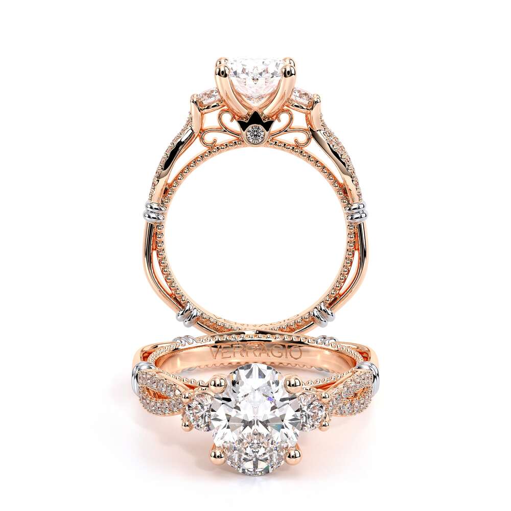 Parisian-129OV is an intricately woven diamond band three-stone engagement ring that highlights the traditional round brilliant side stones. It is accompanied by our signature Verragio beading and the Timeless wraps that accentuates the Oval center diamond.