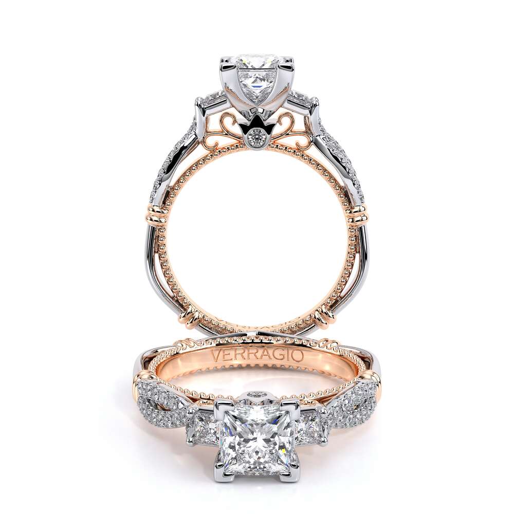 Parisian-129P is an intricately woven diamond band three-stone engagement ring that highlights the traditional princess side stones. It is accompanied by our signature Verragio beading and the Timeless wraps that accentuates the princess cut center diamond.