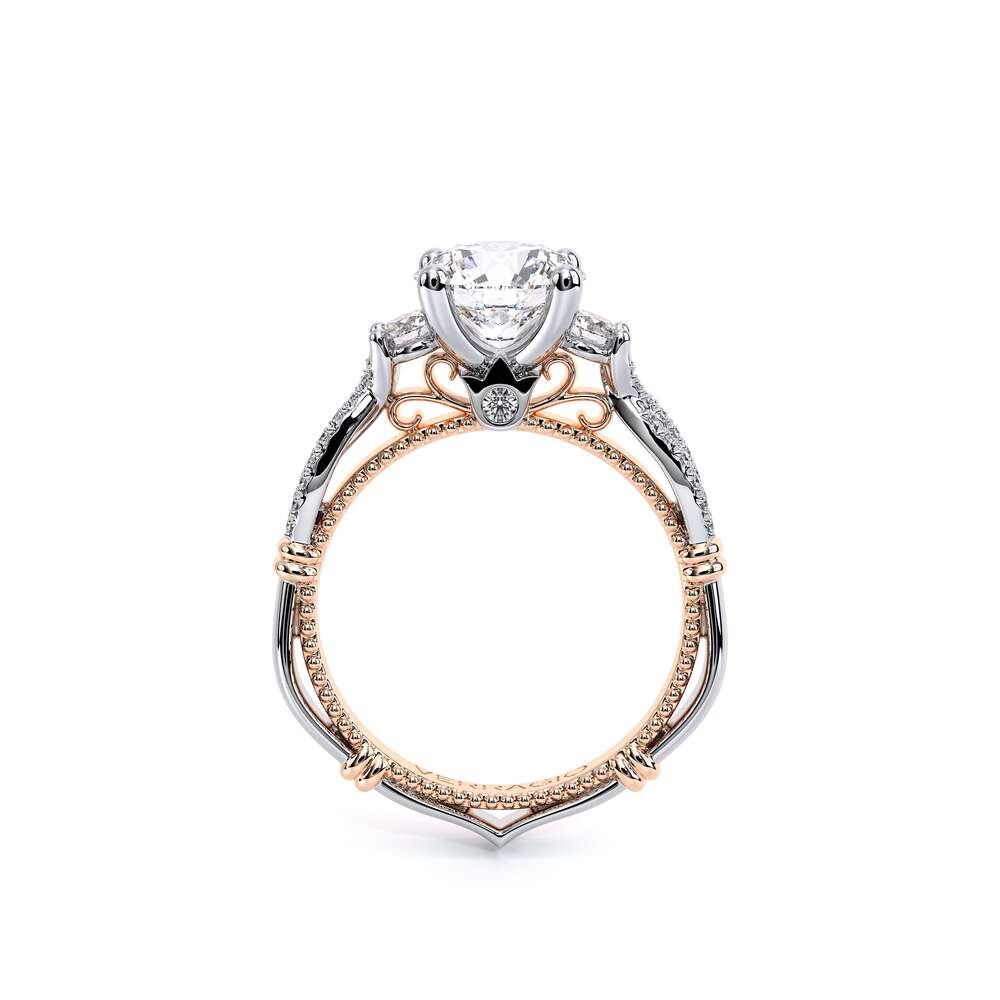 Parisian-129R is an intricately woven diamond band three-stone engagement ring that highlights the traditional round brilliant side stones. It is accompanied by our signature Verragio beading and the Timeless wraps that accentuates the round center diamond.