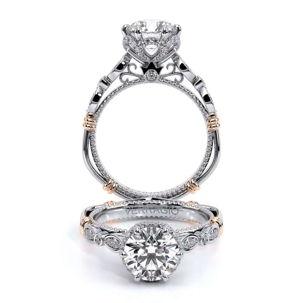 PARISIAN-151R engagement ring carries the vintage scalloped design while adding a beautiful handcrafted diamond tiara to enhance the round center diamond. Featuring our rose gold Timeless wraps Parisian Lace and Verragio' s signature beading- this ring is the complete package.