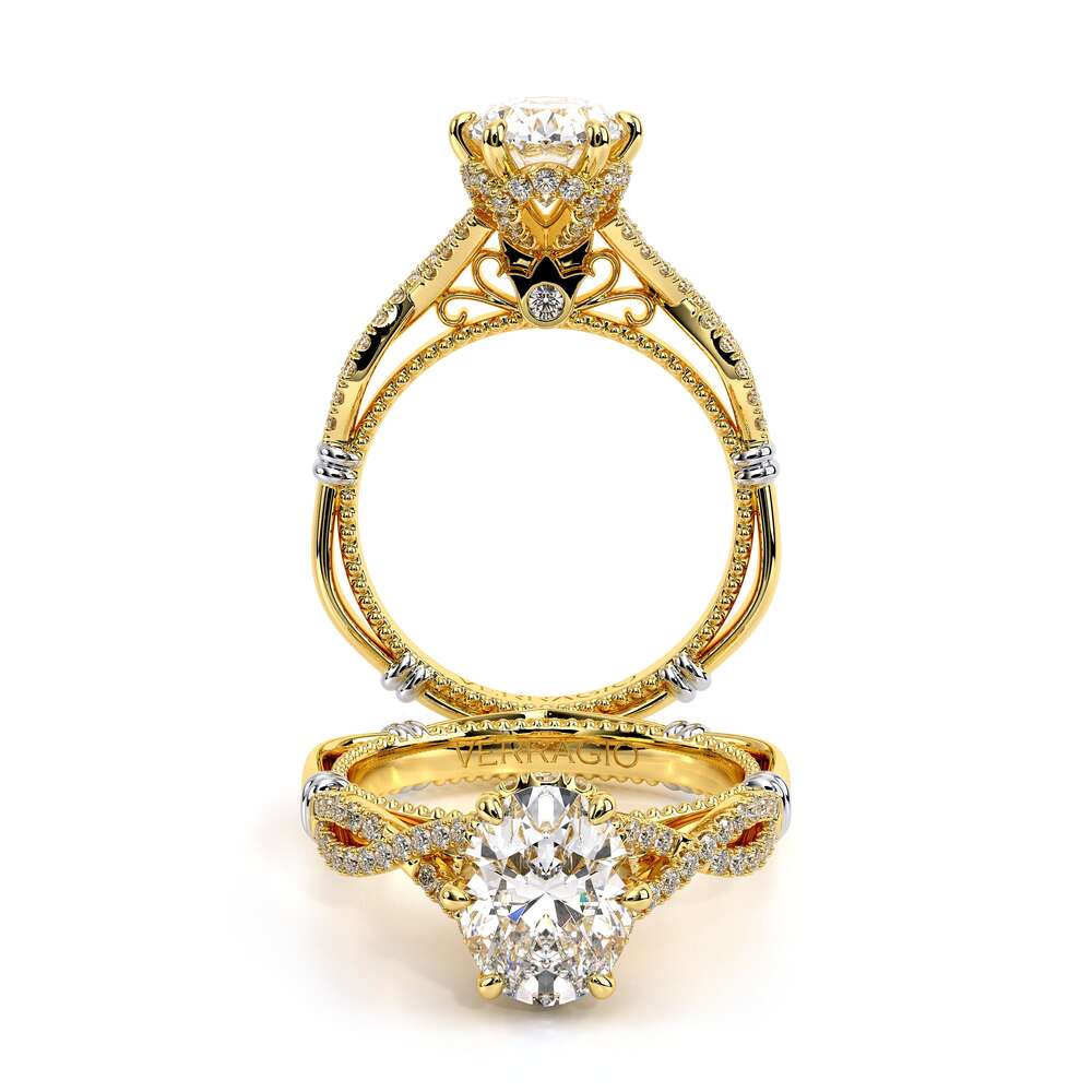 Parisian-153OV is a uniquely designed engagement ring that showcases Verragio' s diamond encrusted tiara that enhances a princess diamond center. The details continue through with the addition of the Timeless wraps Parisian lace and Verragio signature beading.