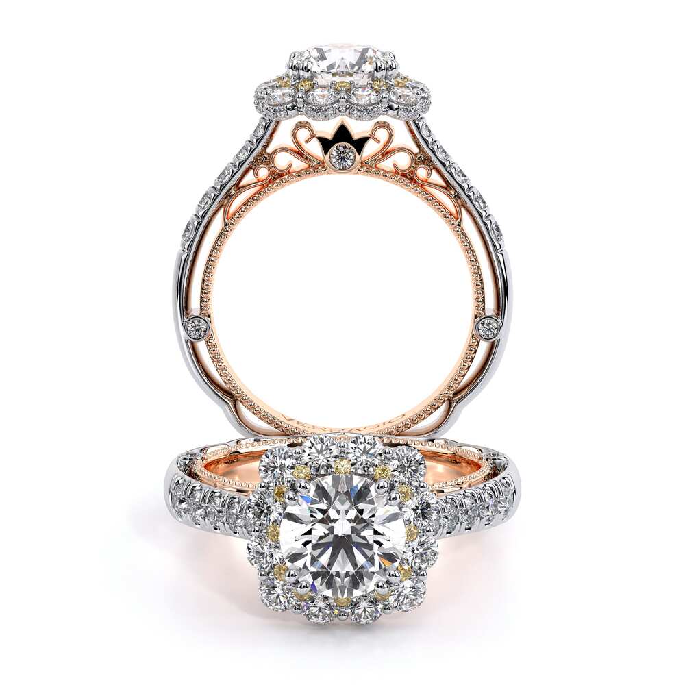 VENETIAN-5080CU engagement ring features an Enchanted diamond cushion Halo with a three layer halo design adding on to the sparkle of the center round diamond. This beauty features graduating round brilliant diamonds on the shank all infused together with our handcrafted lace and signature beading on the inside. The artistry and the craftsmanship of this ring will effortlessly make you stand out and shine.