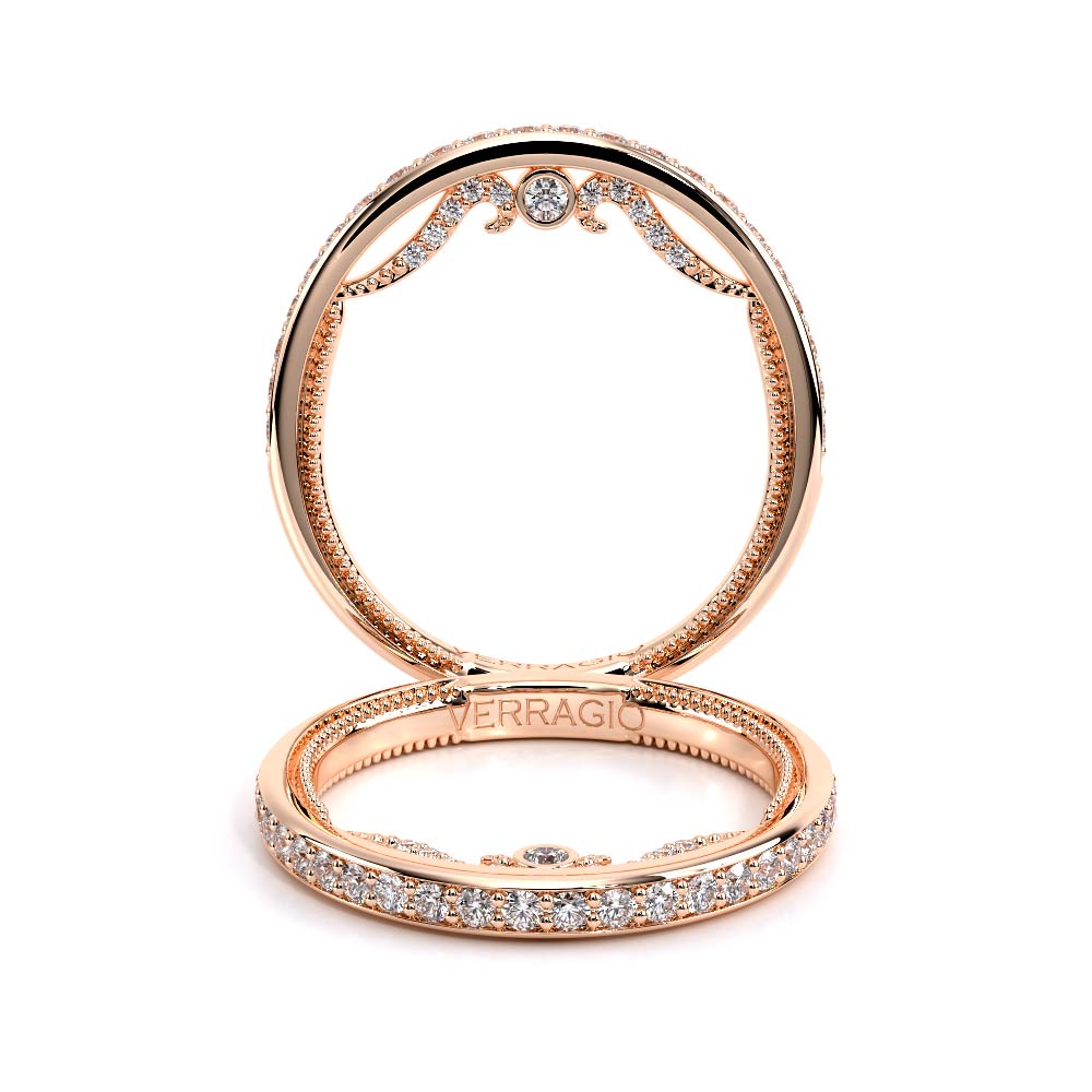 INSIGNIA-7106W wedding band from the Insignia Collection, featuring bead set round brilliant-cut diamonds in a channel encompassed by Verragio's timeless signature beading and crest.