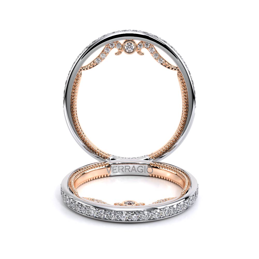 INSIGNIA-7106W wedding band from the Insignia Collection, featuring bead set round brilliant-cut diamonds in a channel encompassed by Verragio's timeless signature beading and crest.